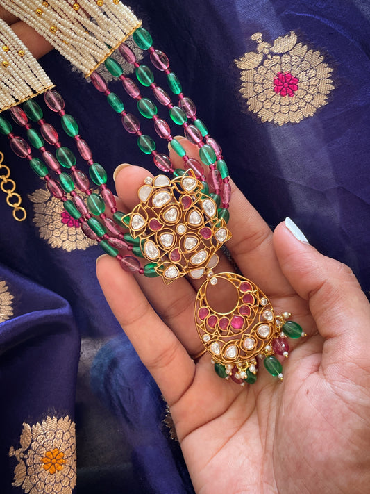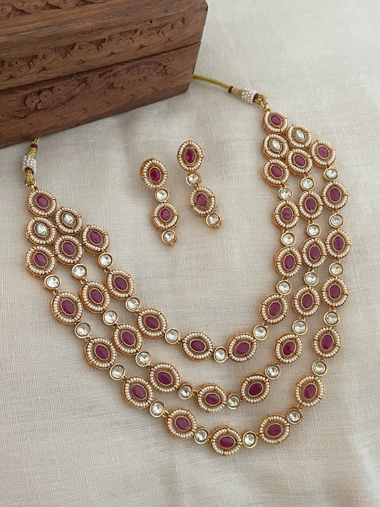 Rabhya 3 Line Ruby Polki & Pearl Necklace Set