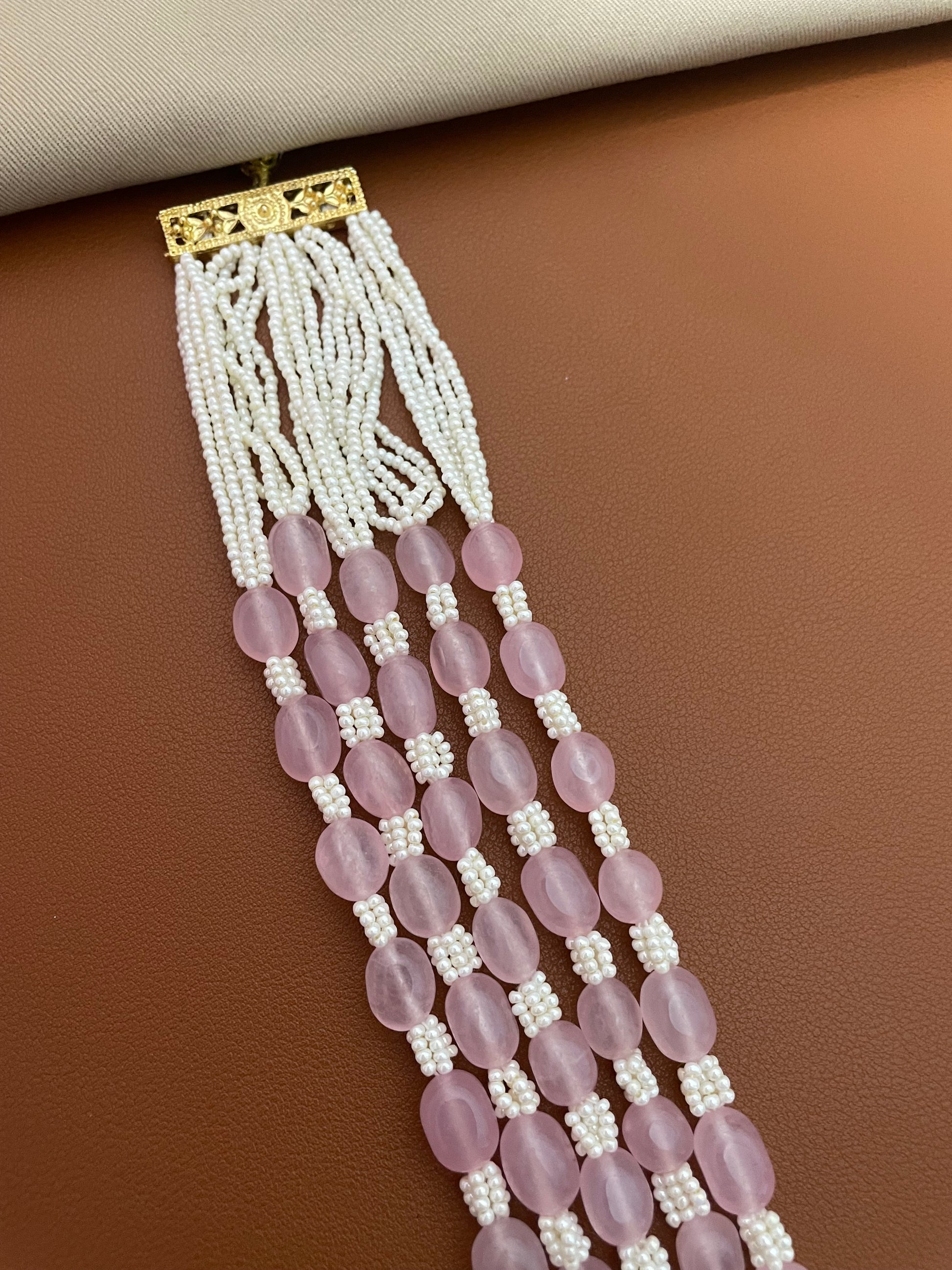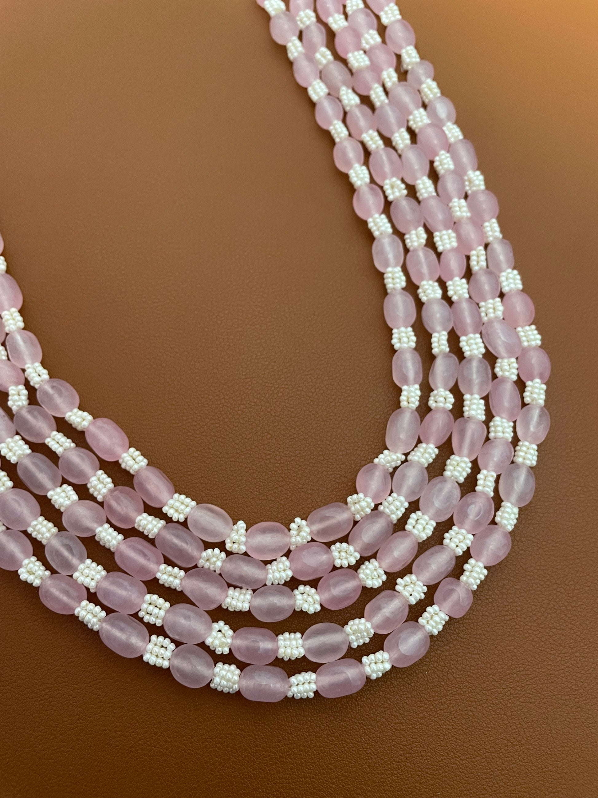 Classic Pink Quartz & Pearl 5 Strand Mala Necklace