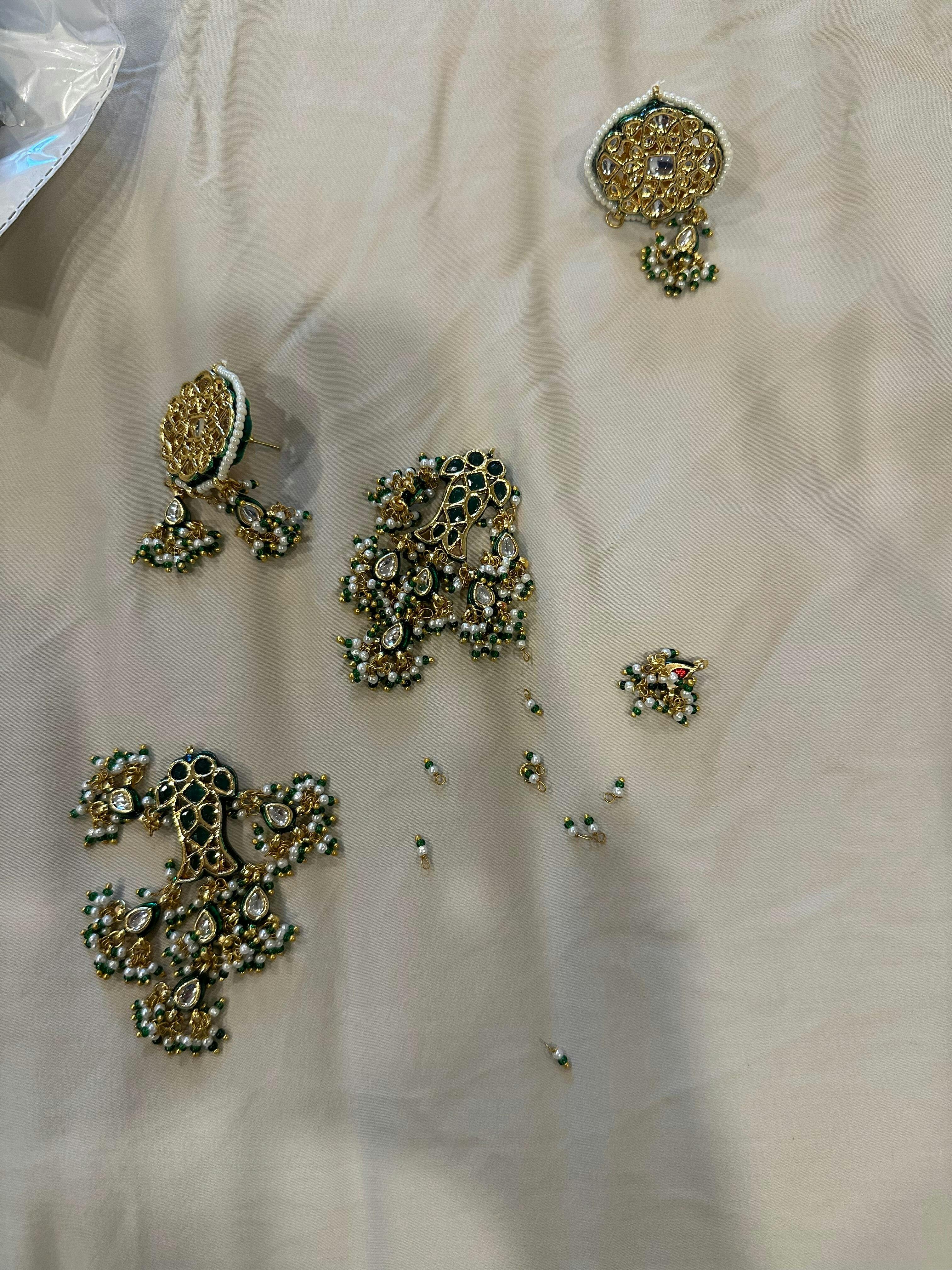 Inspired by the ceiling details from the ancient Mughal forts of Rajasthan, we created the Rani Reshma Kundan Earrings. They feature gorgeous Mughal motifs along with antique machli(fish) design expressed through jadau work s. Finally accentuated and strung with finest quality faux emerald beads and pearls to finish the look.